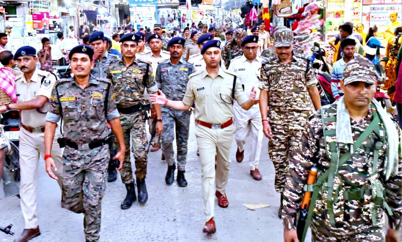 सीआरपीएफ व सशस्त्र पुलिस बल के जवानों के साथ शहर के विभिन्न मार्गों निकला फ्लैग मार्च